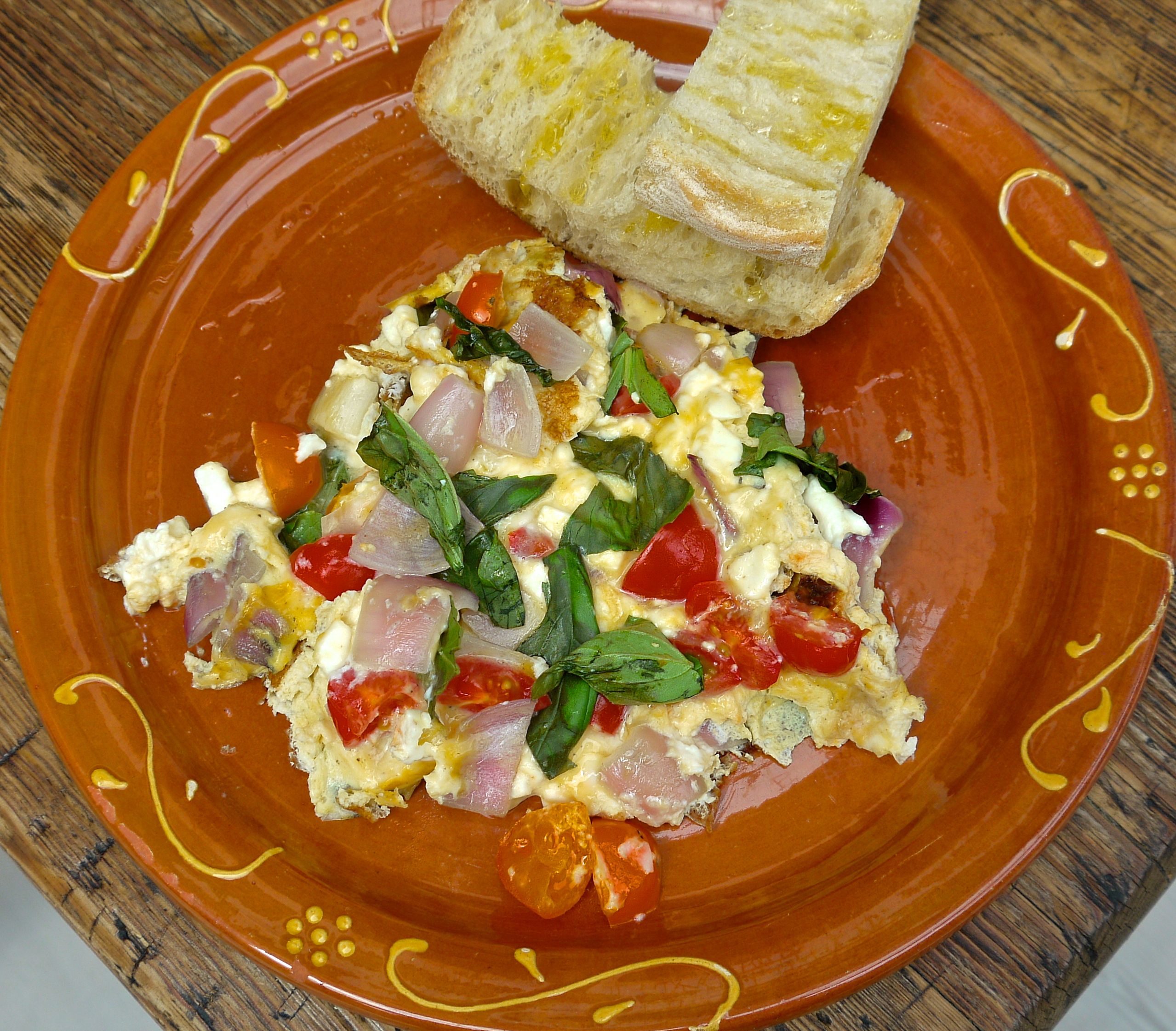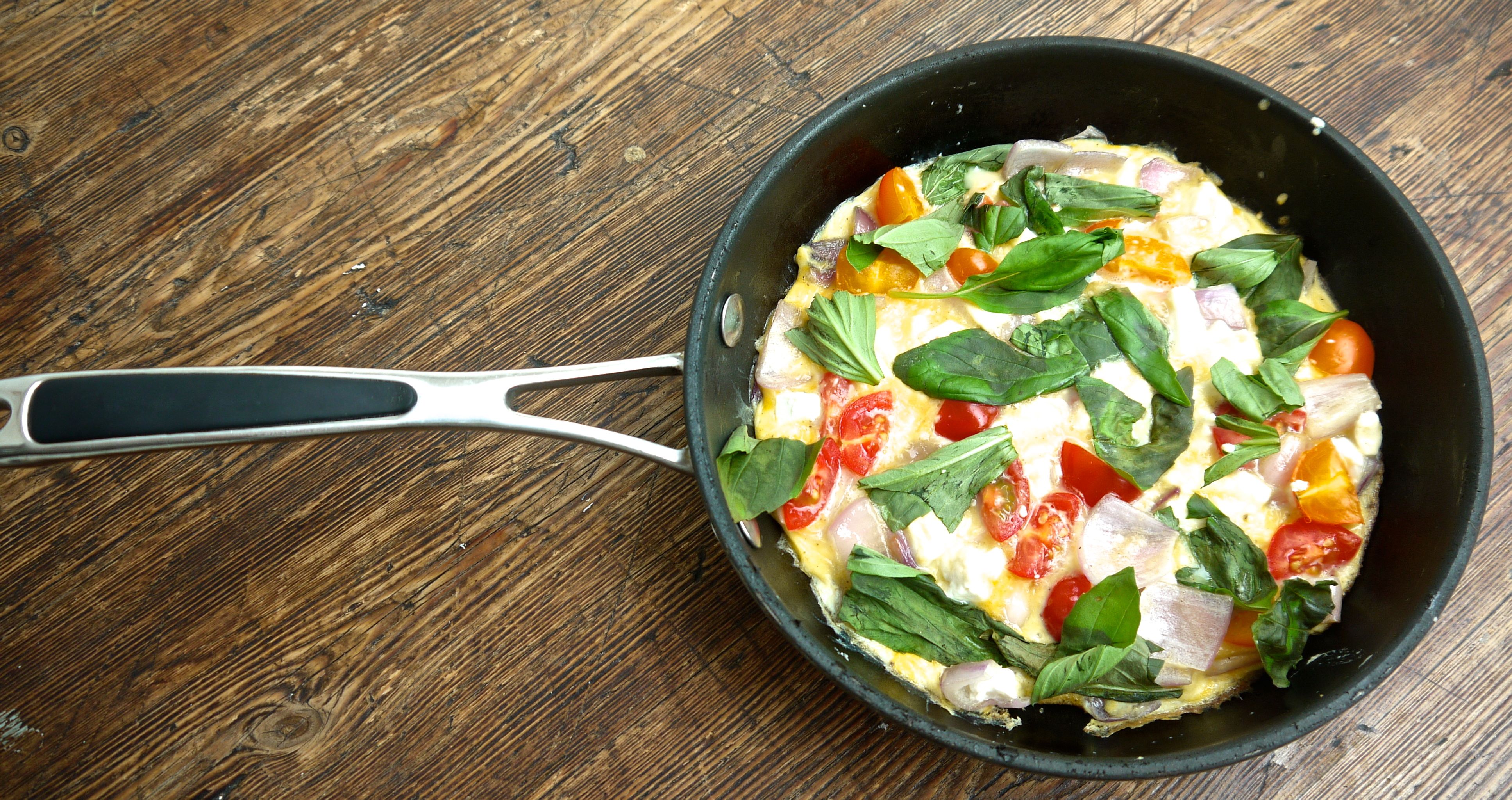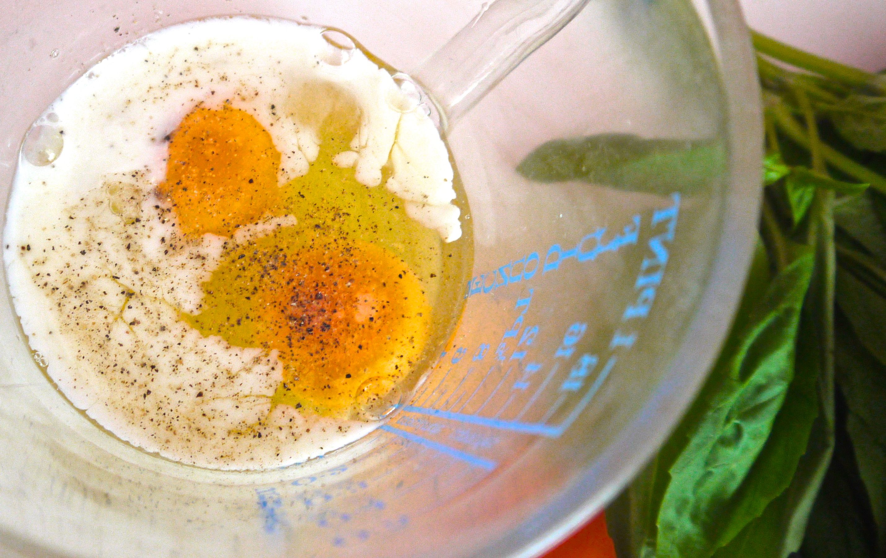 - Scatter the basil leaves over the pan and turn the heat right down. Leave the eggs until the top is solid, I don’t like to flip them because they always end up falling apart when I do that! When it is done slide the omelette out onto a plate and serve with the bread. Unfortunately my frying pan has become more stick than non-stick so it looked a bit messy but it still tasted yummy!