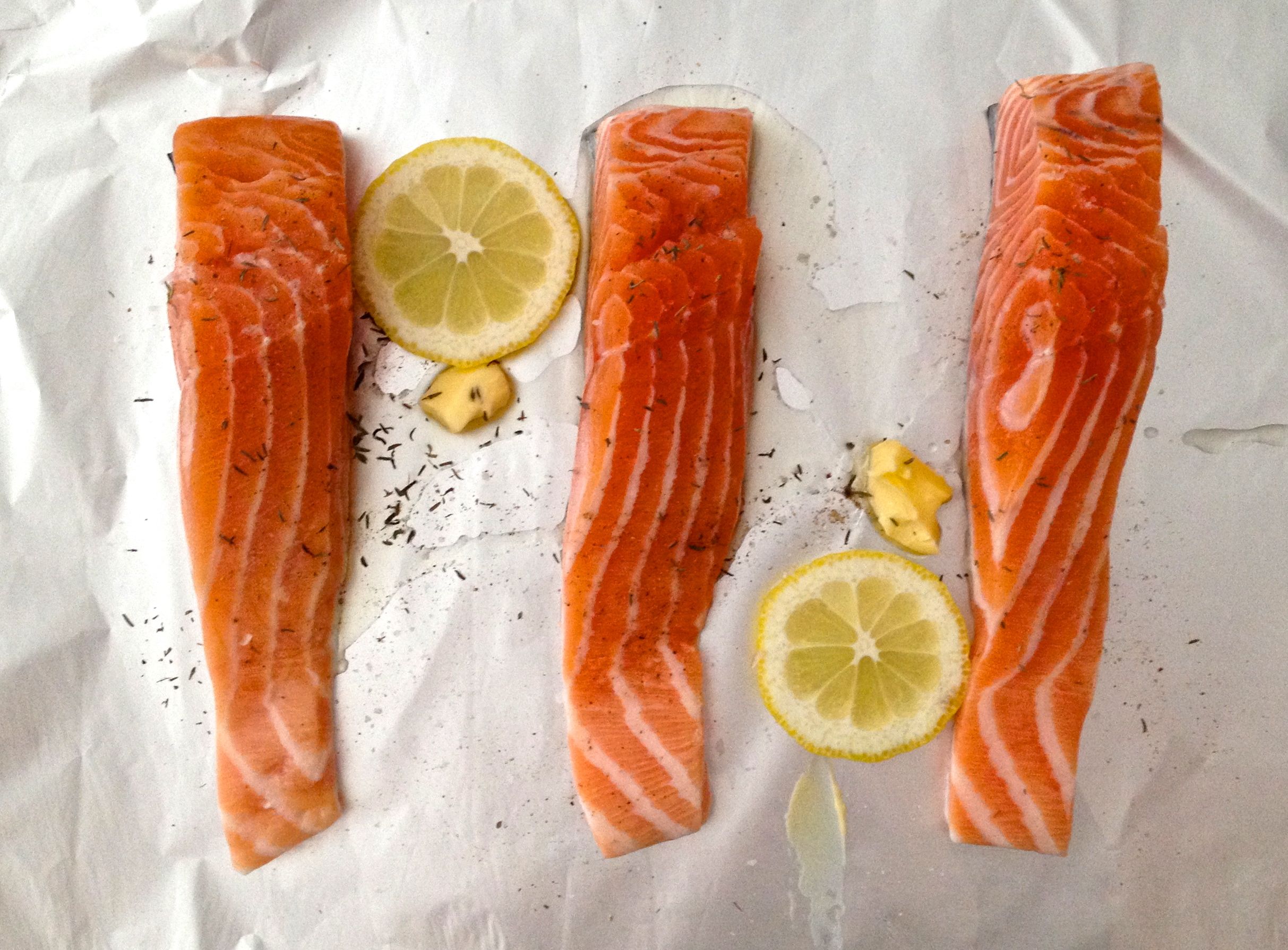 - Start by sorting out the salmon. Lay the salmon on a large square of tinfoil. Drizzle it with sunflower or veg oil and season with salt and pepper. Sprinkle over a teaspoon of dried thyme or add a few sprigs of fresh thyme if you have it (I didn’t). Add a couple of nobs of butter and a couple of slices of lemon. Cover with another sheet of tinfoil and fold the edges together so that it becomes a parcel. Make sure to leave space for the steam to circulate inside. Pop the fillets in the oven at 180 degrees they should take around 20-25 minutes depending on the size.