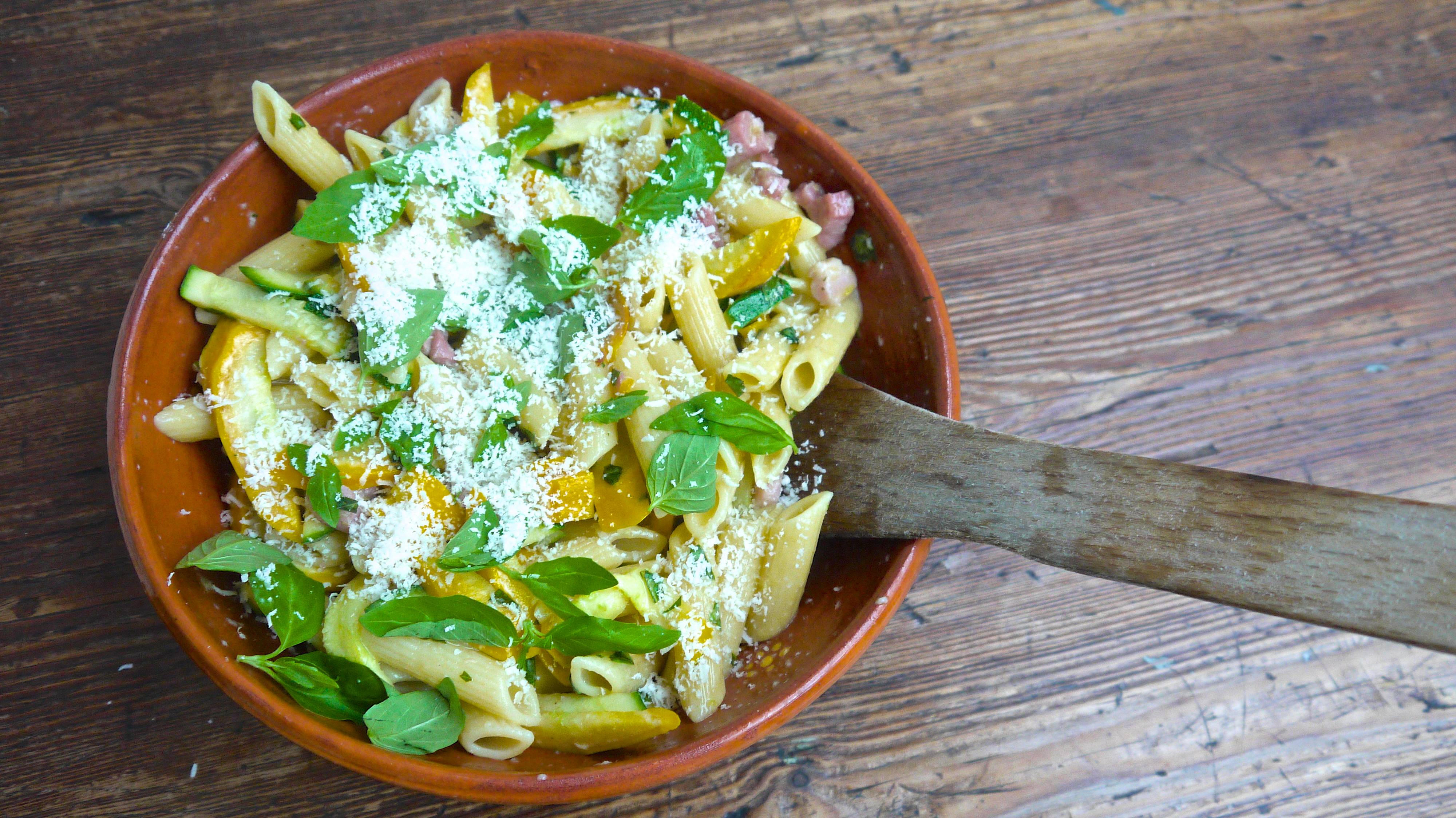 - In a large bowl combine the pasta, courgette and pancetta with the egg and add some pasta water until the sauce is the correct consistency.