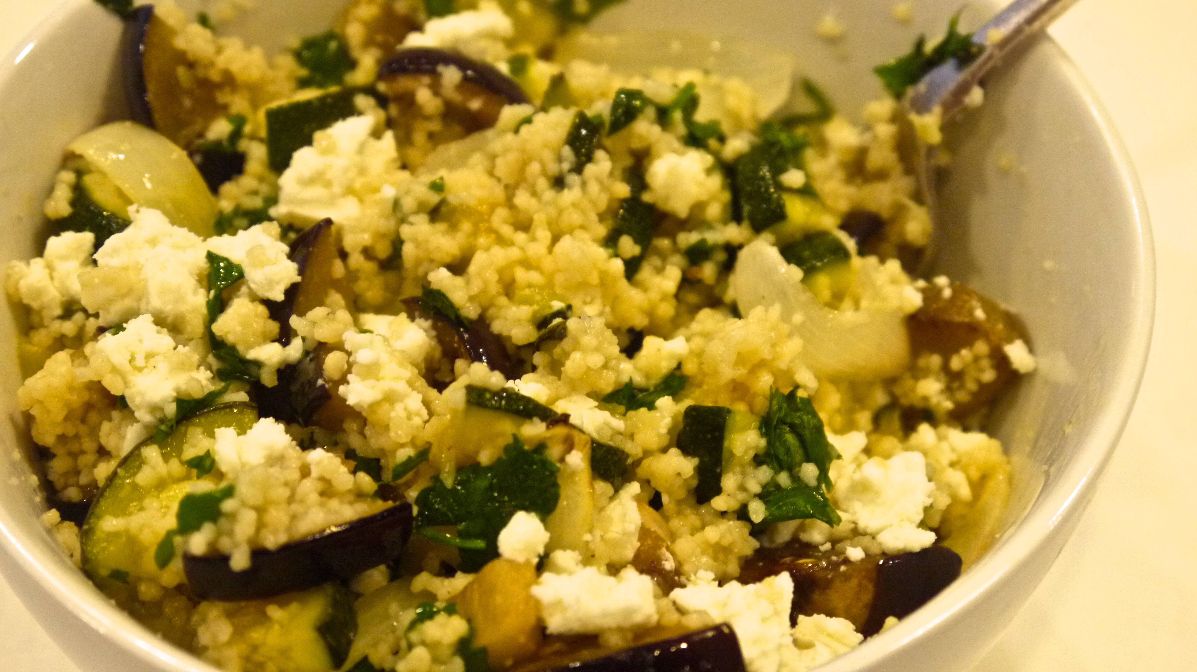 - If the veggies are now done stir them through the couscous and leave the peppers to one side. Now stir through the crumbled feta but leave some to one side.