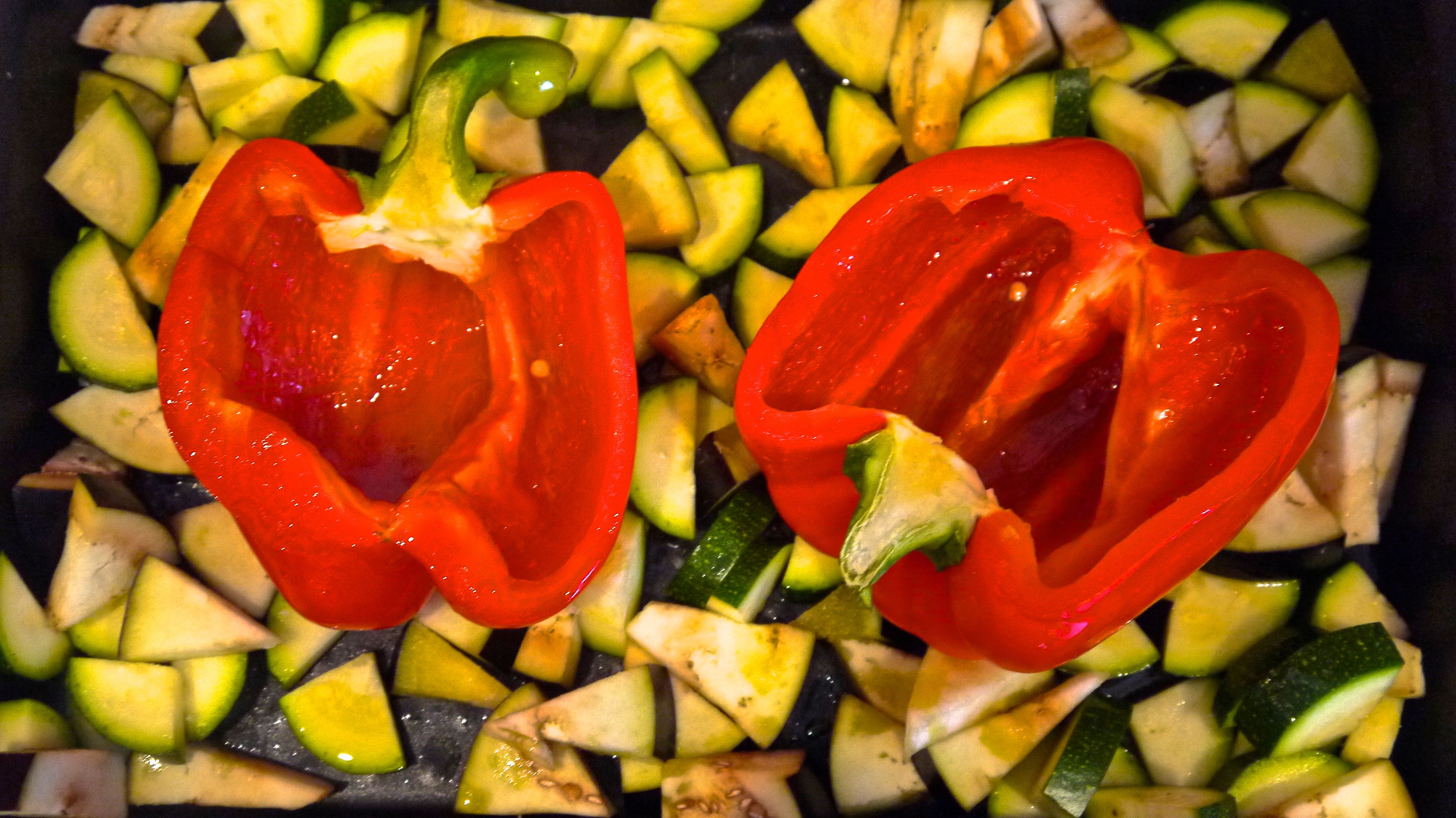 - Start with the veggies. Put the oven on to 180 degrees. Cut the peppers in half length ways rub them with oil and salt and put them straight in the oven as they take longer then the other veg.