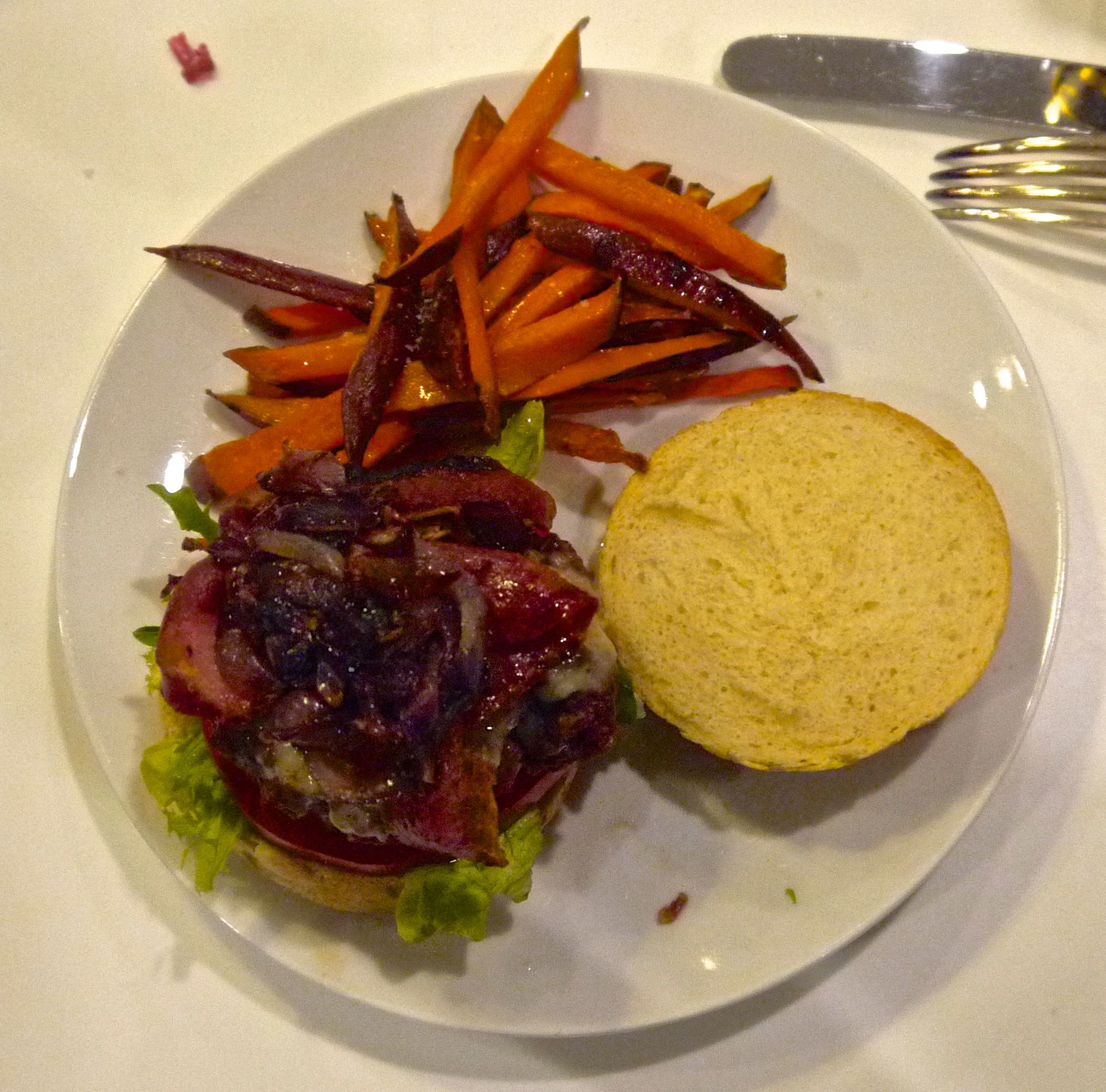 Cost rating* I used 1/4 of a pack of mince costing £4, an onion costing 21p, 1/2 a packet of bacon costing £2.80, 1/10 f a block of cheese costing £3, 2 rolls costing 40p, 1/2 a pack of lettuce costing 80p, 1/10 of a jar of gherkins costing £1, 1/2 a beef tomato costing 80p, 2 sweet potatoes costing 25p, 1/20 of a bottle of ketchup costing £2. Total cost:£5.10, cost per head £2.55.