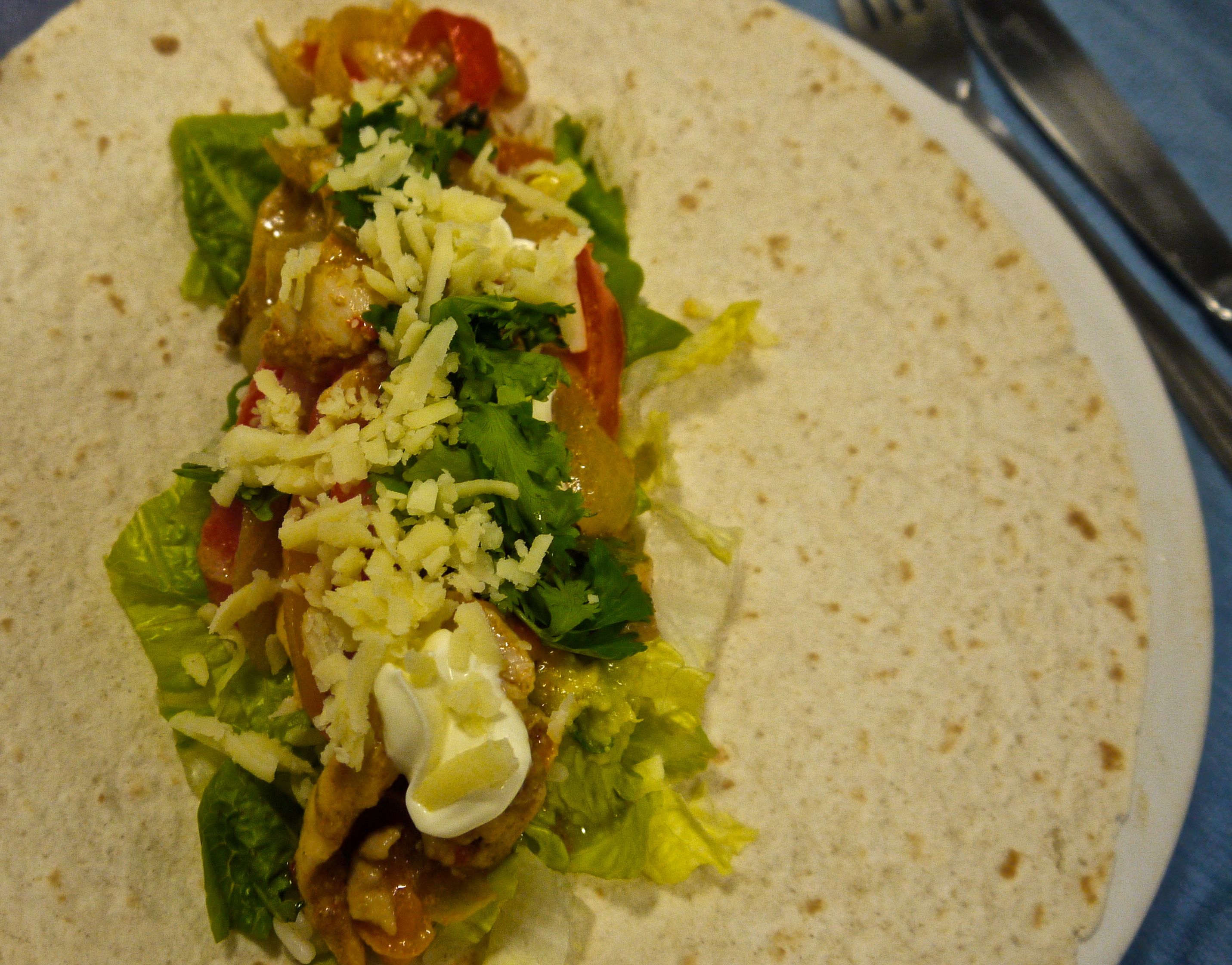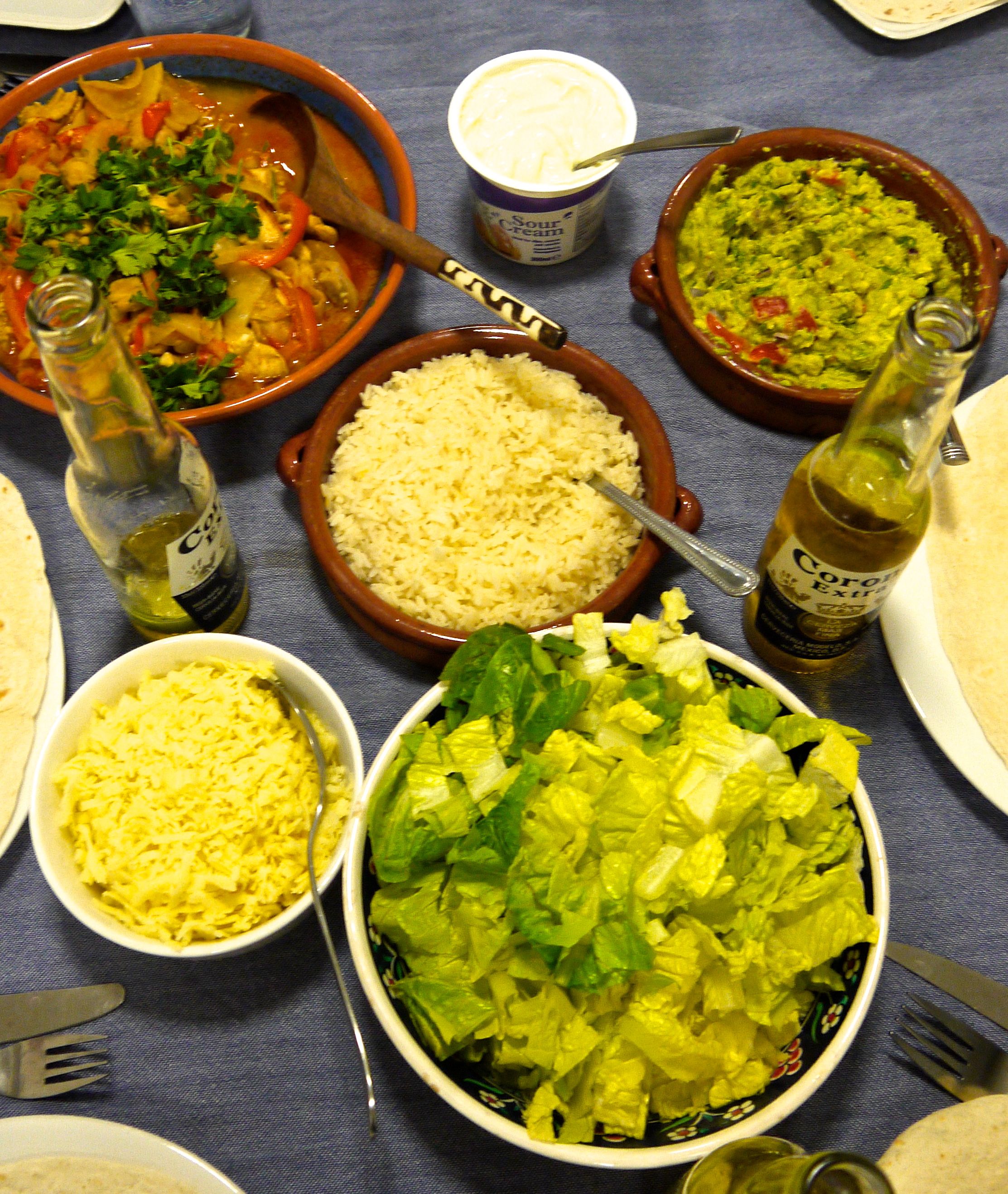 Cost rating ** I used: an onion costing 18p, chicken thighs costing £3.50, one and a half peppers costing 70p, 1/3 of a pack of chillies costing 60p, 1/2 a tin of tomatoes costing 40p, coriander costing 80p, 2 limes costing 30p, 2 avocados costing 90p, 1/4 of a box of tomatoes costing £1.75, 1/4 of a red onion costing 18p, sour cream costing 55p, 1/2 a block of cheese costing £2.17, one lettuce costing 70p, 2 packets of tortillas costing £1.20, 1/10 of a bag of rice costing 45p. Total cost: £14.50, £2.40 a head.