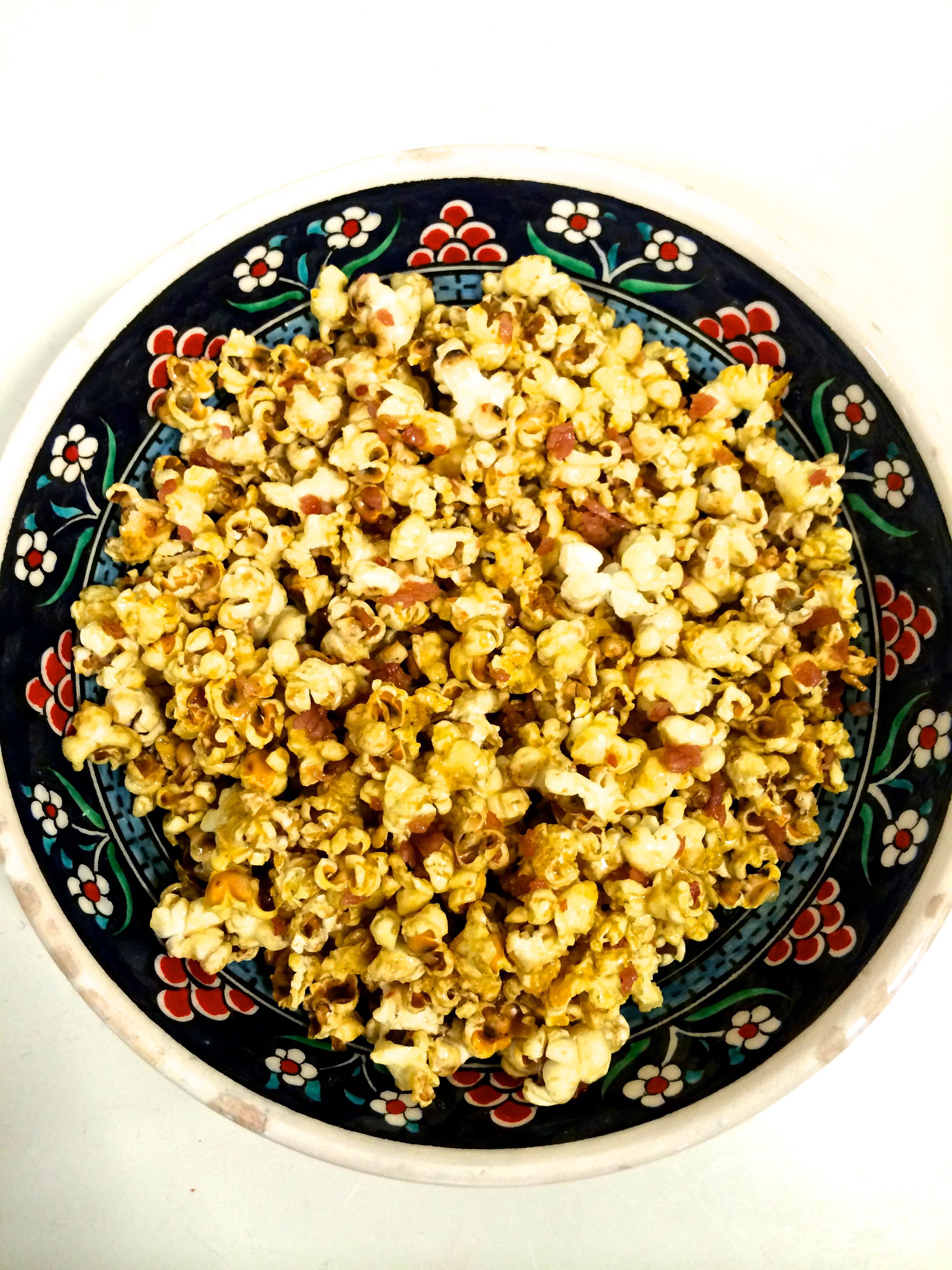 - Grill the bacon until really crispy on both sides. Then crumble it up or finely chop it. Lay the popped corn out flat on a tray and pick through and remove any burnt bits or unpopped kernels. Pour over the maple syrup and sprinkle over the bacon. Leave out for 30 minutes to dry off or put in the oven on a very low heat for 10/15 minutes. Bag it up and sneak it into the cinema!