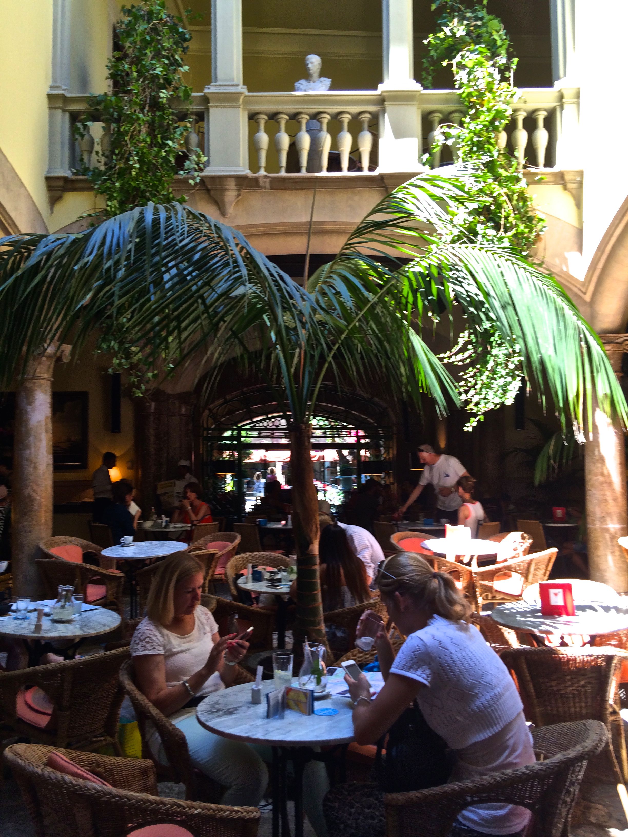 For Lunch… Cappucino Gran Cafe: The stalwart of the burgeoning Cappuccino chain, this central Cafe provides a much needed respite from the hustle of the city. You can chose to eat either inside, in what would have been the entrance hall to this grand townhouse, or outside in a beautiful courtyard . The Gran Cafe has an almost colonial feel about it, with huge ceiling fans cooling the large dining hall and leafy palms intermingling with the tables. The waiting staff are fully dressed with starched white shirts and long black aprons and wealthy patrons enjoy pricy cocktails. The food and drinks are not cheap but if looking for a spot to avoid the midday sun, the surroundings make it worth it. Also portions are huge. The club sandwich in particular is delicious and with a side of chips is more than enough for a lunch for two. A lunch with cocktails costs around €25 a head. http://www.grupocappuccino.com/