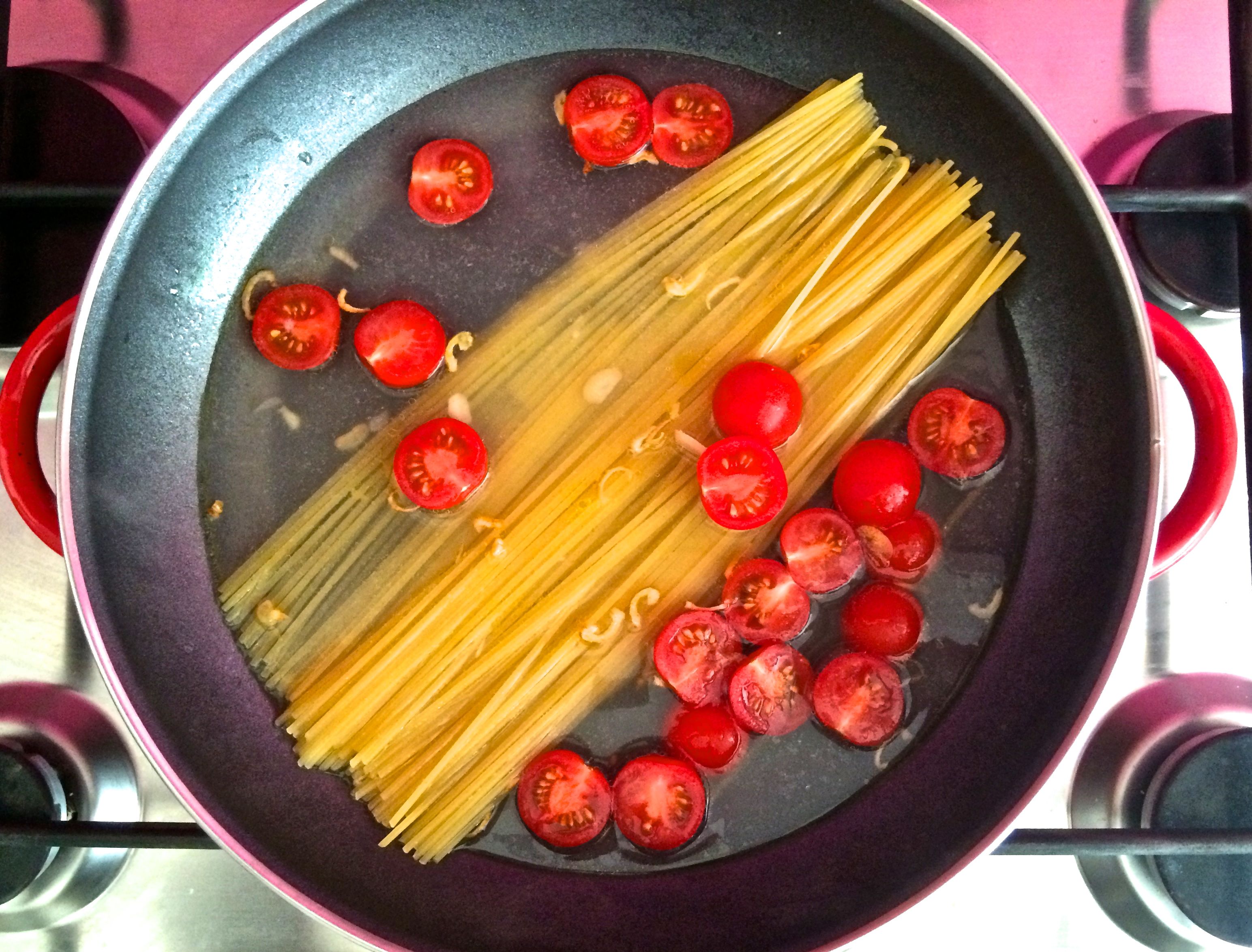 - Once the water is boiled add the pasta and tomatoes to the pan and pour over as little boiling water as it takes to just cover the pasta, you can add more later.