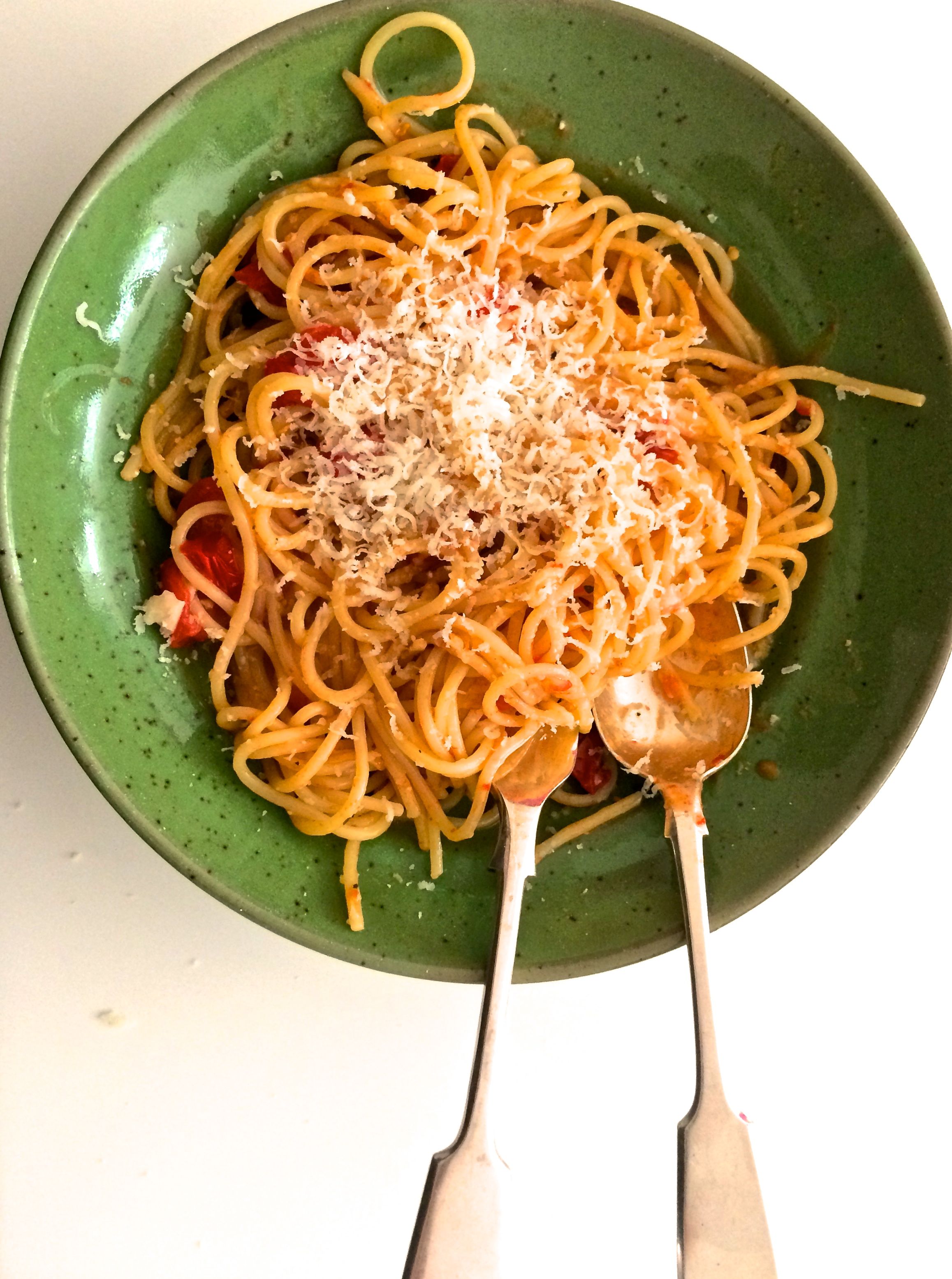 - Once most of the water is evaporated test to see if the pasta is cooked. If not add a little more water. If it is, stir until all that is left is a glossy tomato-rich sauce. Serve with lots of parmesan.