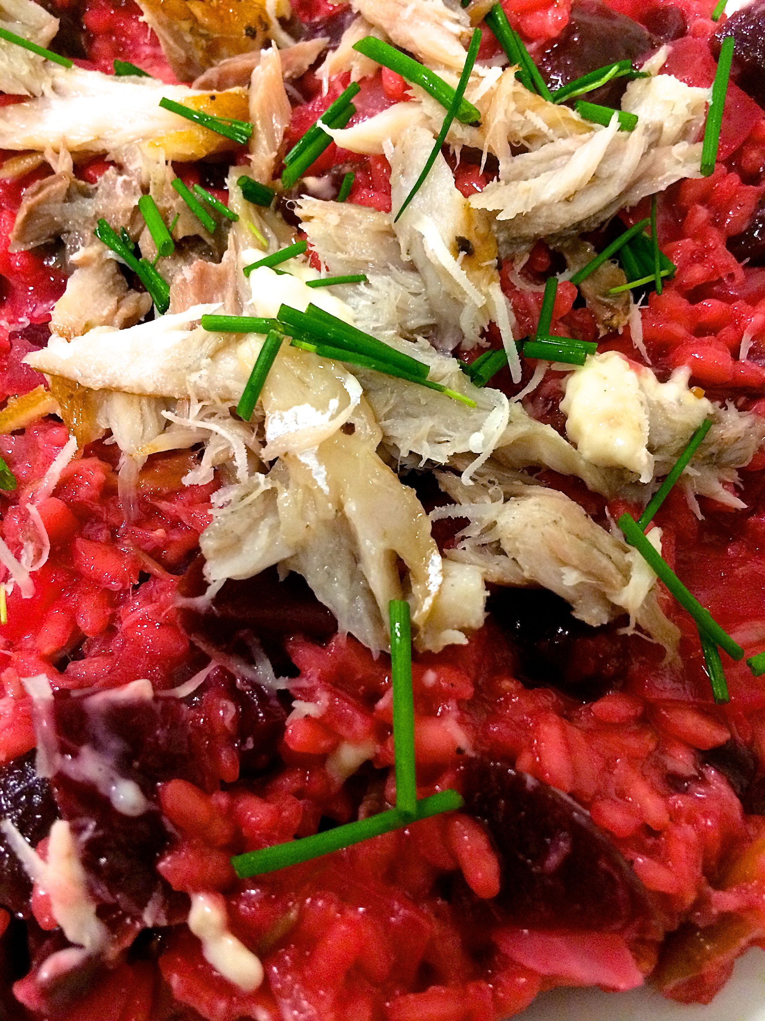 - Once the stock has nearly run out, and hopefully the rice is almost cooked (this should take about 20 minutes), flake in half the fish and stir through the beetroot. Now add the final bit of stock, the horseradish and salt and pepper to taste. It may also need a little more lemon juice.