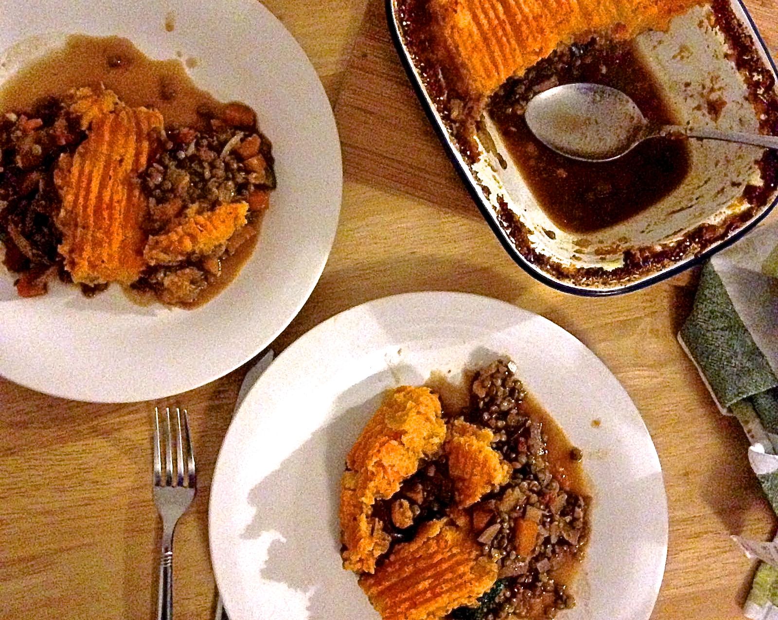 Actually cooking without meat is pretty hard, especially if you like trying out new things in the kitchen. At first it was an exciting challenge, but after about a month of the same 5 vegetables variously disguised as curries, chilli and stew, I was starting to get pretty bored. This shepherds pie, despite not exactly reinventing the wheel, does provide a bit of a contrast. The lentils are a good alternative to mince and give a fairly similar texture and the whole dish is comfortingly familiar; perfect for a chilly winter night.